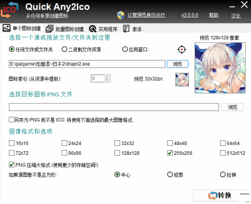 选择源文件和目标文件以及所需的选项和格式后,即可创建ICO或PNG文件。